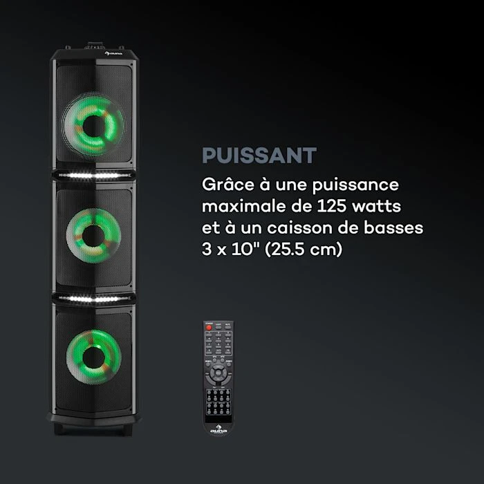 - Puissante : 250 watts max. et 3 x subwoofers de 10″ (25,5 cm)