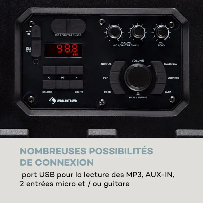 - Connexions pratiques : AUX-IN, 2 entrées micro et/ou guitare