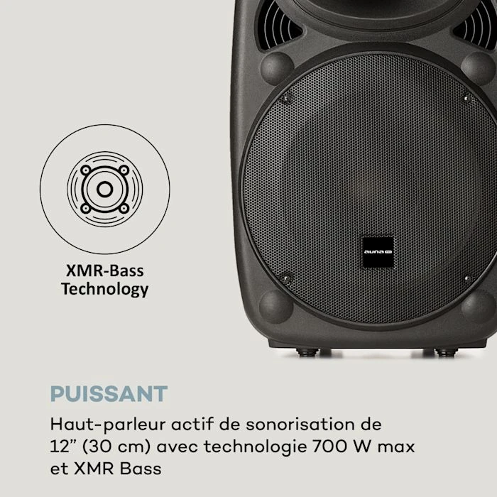 - Beaucoup de puissance : enceinte active de sono de 12″ (30 cm) et 700 W max avec technologie XMR Bass