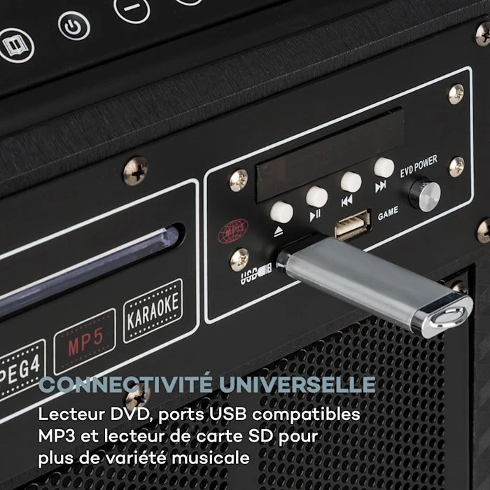 - Connexions : 1 x lecteur DVD, 3 x ports USB, 1 x lecteur de carte SD, 1 x entrée MIC/guitare 6,3 mm, 1 x Line-In RCA, 1 x Line-Out RCA, 1 x sortie vidéo RCA