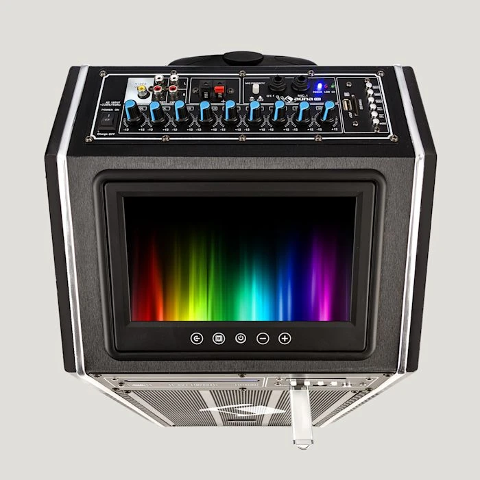 Fini la connexion pénible d’appareils individuels pour un système vocal parfait ! Avec le lecteur de DVD intégré, vous pouvez lire les vidéos de karaoké dans différents formats et les afficher sur son grand écran TFT de 10″ (23 cm). Le puissant subwoofer de 10″ avec technologie XMR basse fournit des basses percutantes à l’environnement qui vous donnent des frissons, tandis que le tweeter de 3″ (7,5 cm) assure un son bien équilibré. De nombreuses possibilités de branchement vous offrent le son désiré : par connexion Bluetooth pour les listes de lecture sur smartphone, tablette ou lecteur MP3, par port USB et lecteur de cartes SD, par entrée ligne d’autres appareils audio HiFi tels que les lecteurs CD et les chaînes stéréo. L’entrée micro peut bien sûr accueillir le son puissant d’une guitare électrique. Les deux micros radio UHF sans fil se chargent des animations karaoké passionnées, des performances vocales entraînantes et des animations convaicantes : libérés de tout câble, ils excellent avec leur retransmission sans parasite, même sur de longues portées – parfait pour captiver tout le public. Le système de sono mobile auna Pro DisGo Box 100 DVD est également équipé pour une utilisation mobile : le boîtier solide peut supporter de nombreuses situations difficiles tandis que la poignée de chariot télescopique rend la traction confortable même pour les grands DJ. Une puissante batterie de 7 A en 12 V assure 3 à 5 heures de fonctionnement continu, tandis que l’indicateur de niveau de charge empêche toute coupure de transmission inattendue. Bien sûr, DisGo Box 100 DVD peut également de connecter facilement au secteur. Une télécommande toutes fonctions permet le contrôle même à distance.