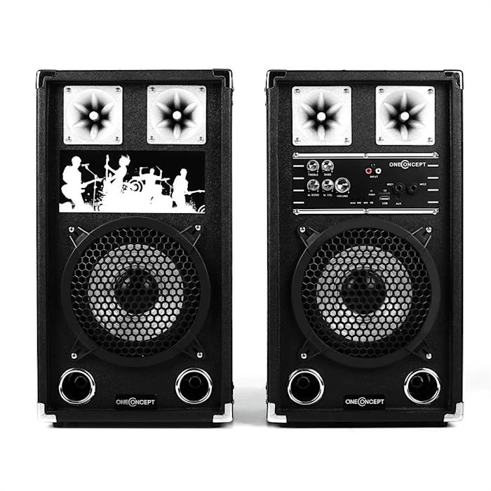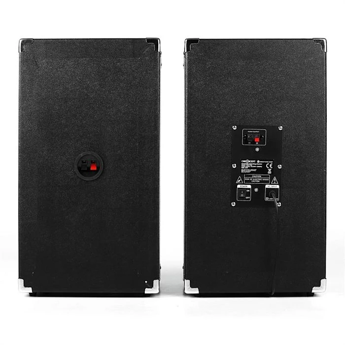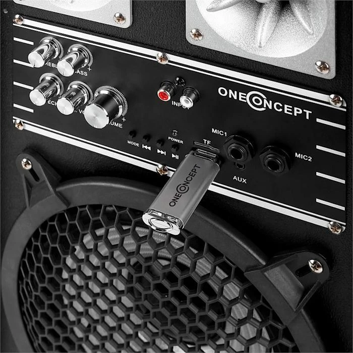 - Connexions: 1 x port USB, 1 x slot microSD, 1 x carte mémoire, 2 x entrées microphone 6,3mm, 1 x entrée jack 3,5 mm AUX, 1 x entrée stéréo ligne RCA, 1 x jeu de bornes d’enceintes (sur chaque enceinte)