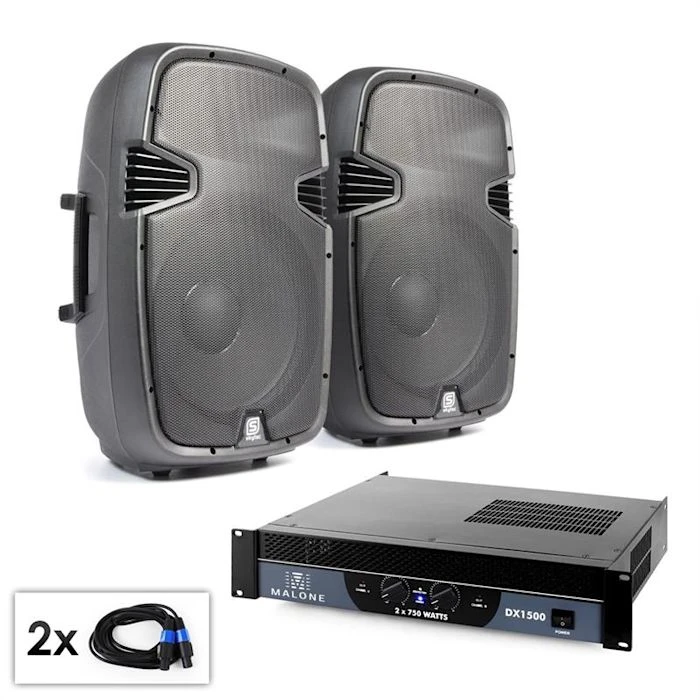 - Ampli PA avec 1500 watts de puissance maximale (2 x 750W à 4 Ohms, 2 x 450W à 8 ohms, 1500W de puissance « pontée » sous 8 ohms)