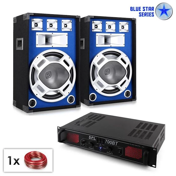 Set sono solide de la série « Blue Star » comprennant deux subwoofers puissant de 38cm et un amplificateur compétent d’une puissance de 700W qui grâce à ses dimensions compactes, convient à un montage en rack 48cm (19″). L’amplificateur a l’avantage de posséder la fonction Bluetooh qui permet l’écoute de musique sans fil en streaming en connexion avec des appareils compatibles Bluetooth tels que ordinateurs, Smartphone et Tablette.