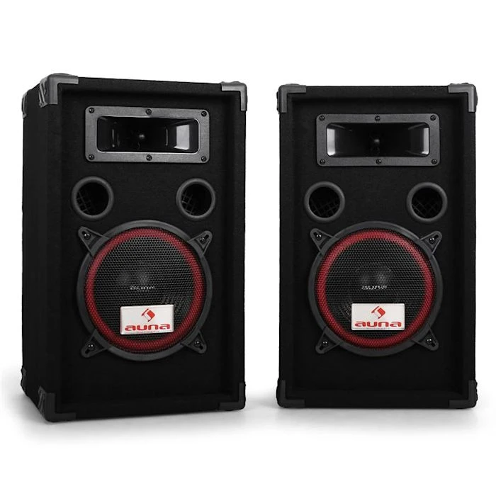 - Paire d’enceintes de sono passives avec un subwoofer de 20 cm (8“), un boîtier Bassreflex et un tweeter Horn