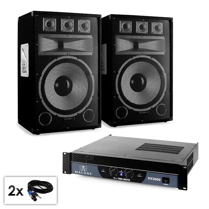 Puissant set de sono comprenant 2 enceintes passives 15″ 250W RMS chacune et un ampli pontable 2 canaux 2000W max.