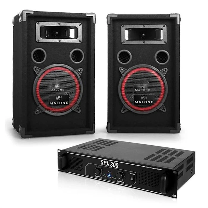 - Paire d’enceintes de sono passives avec un subwoofer de 20 cm (8“), un boîtier Bassreflex et un tweeter Horn