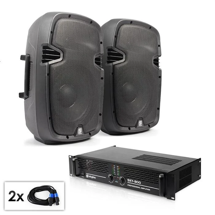 Puissant set de sono comprenant 2 enceintes passives 10″ 150W RMS chacune et un ampli pontable 2 canaux 800W max.
