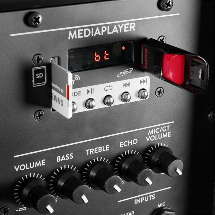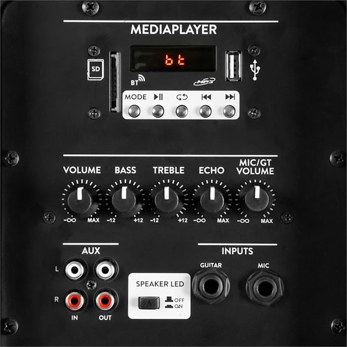 Pour les applications karaoké, l’enceinte comporte une entrée et une section micro. Volume, basse, aigus et écho se règlent séparément, vous pouvez donc modifier le son selon vos préférences personnelles. Un effet LED à commande séparée produit un éclairage de fête coloré.