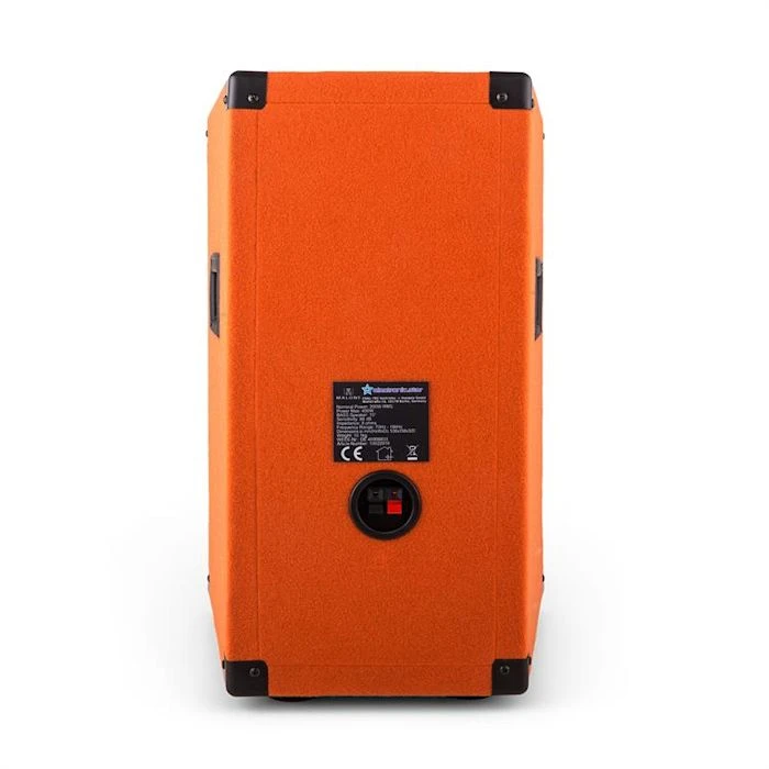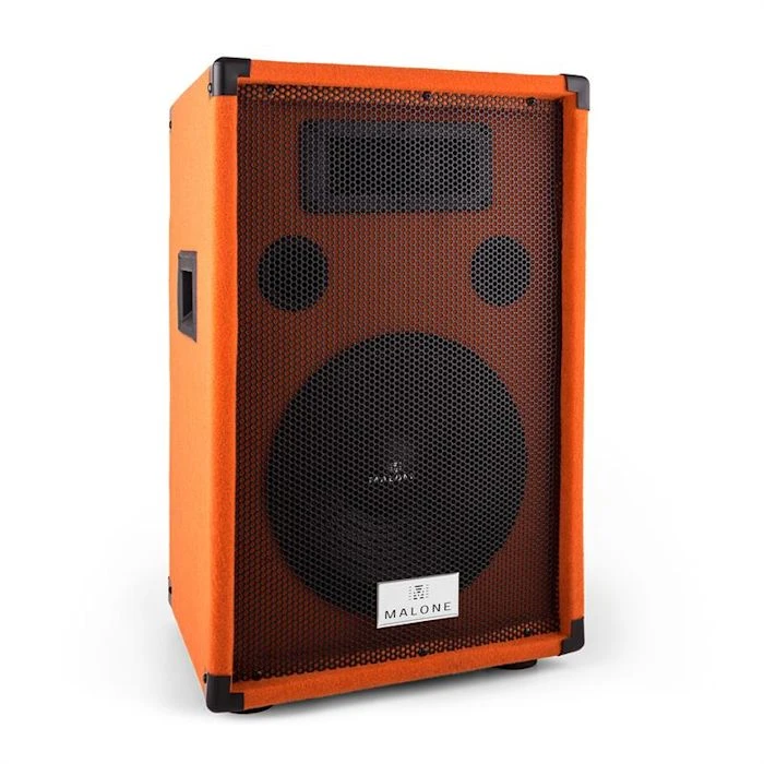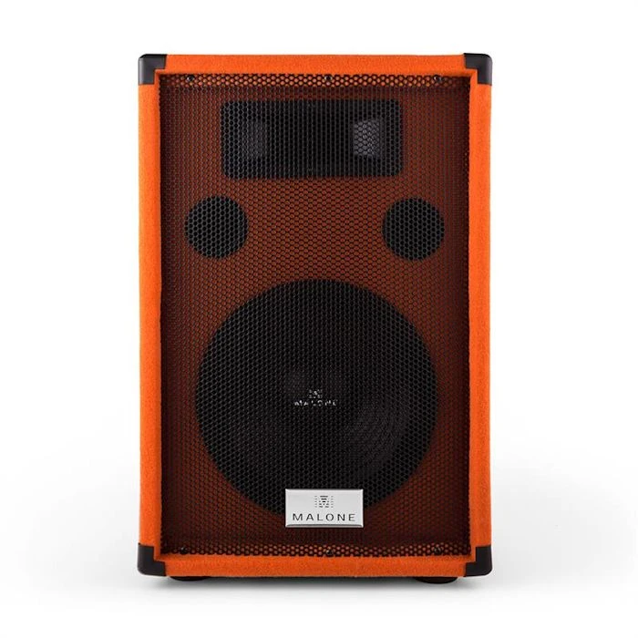 Set de haut-parleurs PA polyvalent et revêtement en feutre orange Malone pour karaoké, repas et soirées privées. Construction résistante avec coins renforcés ainsi qu’une poignée de transport pour une utilisation nomade. Capacité de 200W RMS ou 400W max. et son caisson de basses de 25cm (10″).