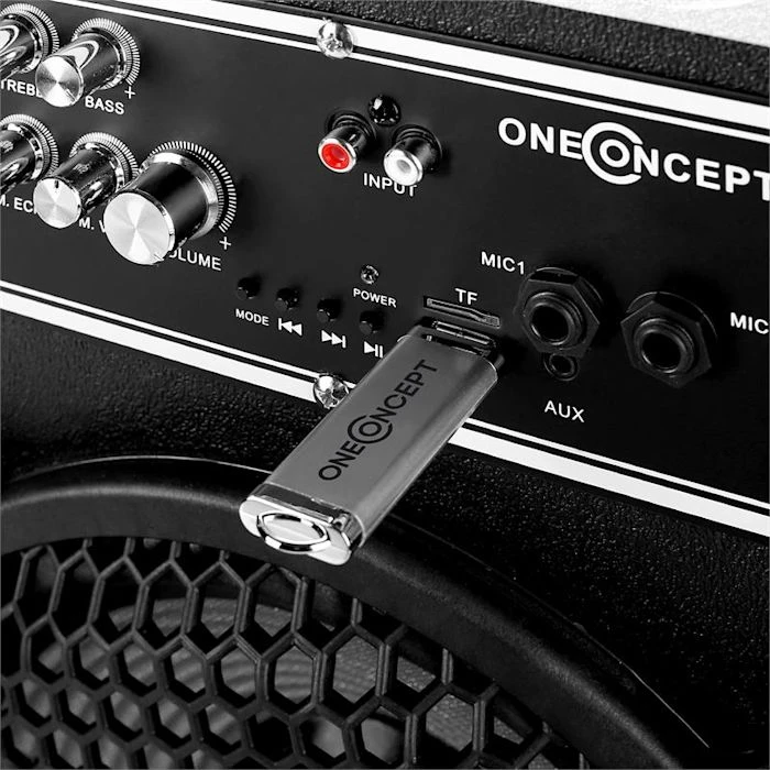 - Connexions: 1 x port USB, 1 x slot microSD, 1 x carte mémoire, 2 x entrées microphone 6,3mm, 1 x entrée jack 3,5 mm AUX, 1 x entrée stéréo ligne RCA, 1 x jeu de bornes d’enceintes (sur chaque enceinte)