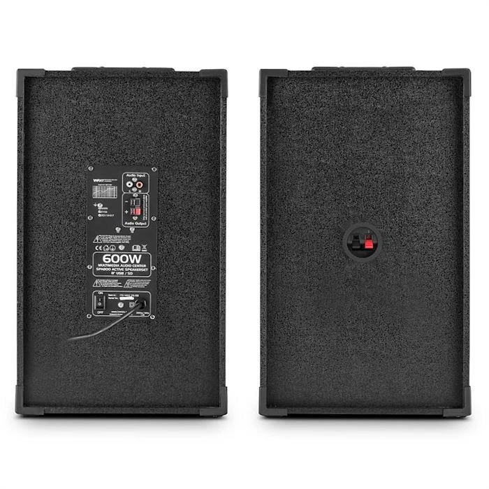 - Connexions sur l’enceinte active : 1 x port USB, 1 x entrée SD/MMC, 2 x entrée jack-micro 6,3mm, 1 x entrée stéréo RCA ligne, 1 x paire de fiches enceintes