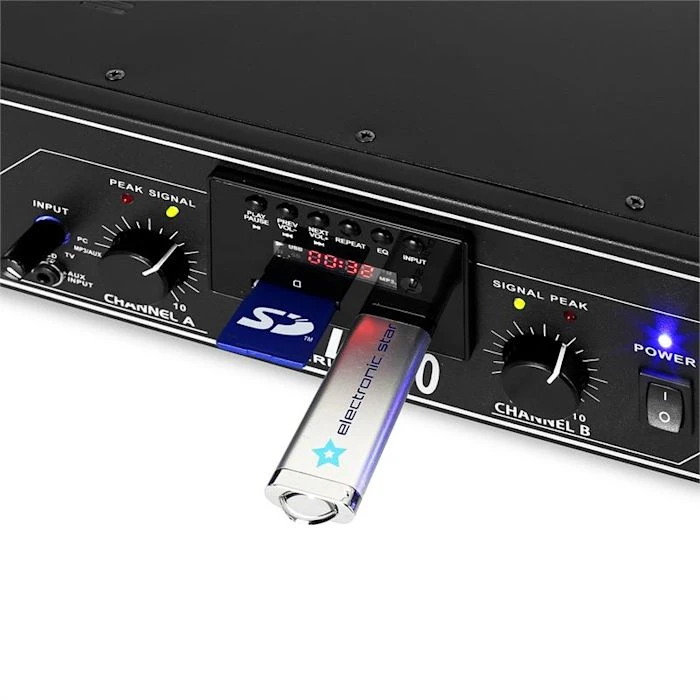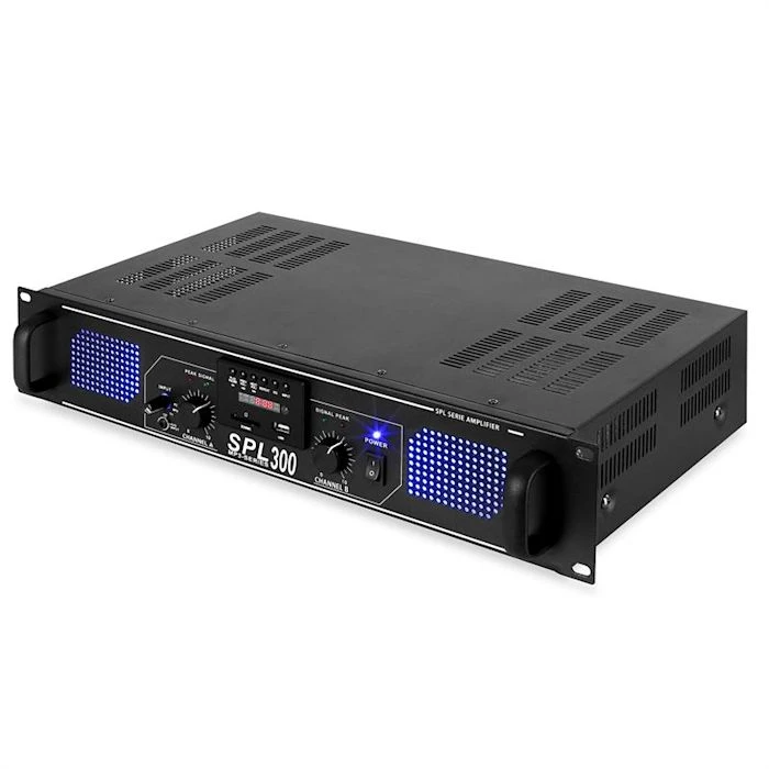 Le SPL300MP3 de Skytec est un amplificateur 2 voies sono d’une puissance de 300 Watt sous 4 Ohm sur lequel vous pourrez brancher directement clé USB et lecteur audio externe et avec une entrée SD.