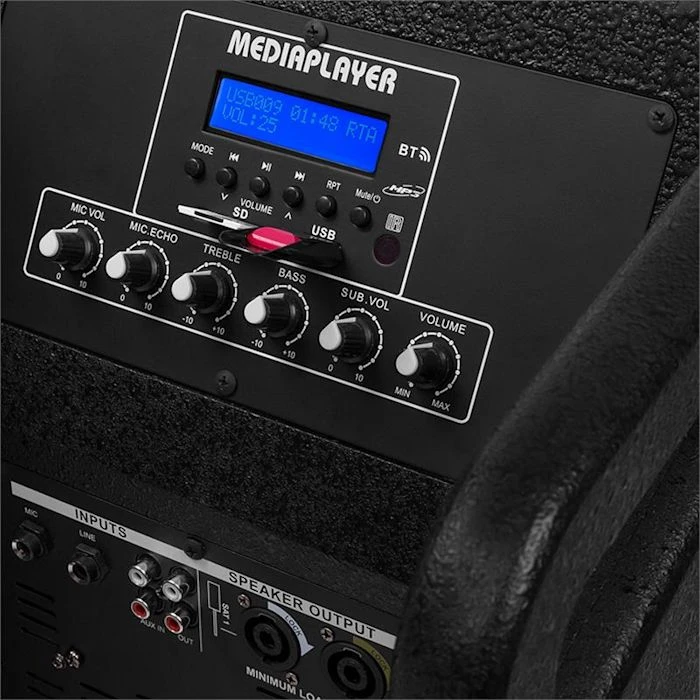 - Connectivité : 1 x Mic-In 6,3 mm, 1 x Line In 6,3 mm, 1 x entrée RCA AUX In (Stéréo), 1 x RCA AUX Out (Stéréo)